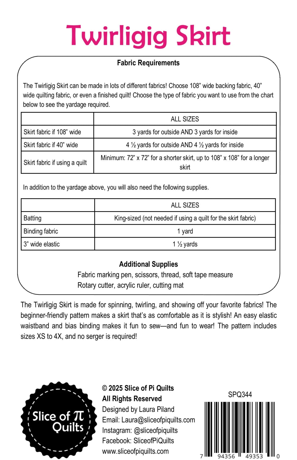 The Twirligig Skirt is made for spinning, twirling, and showing off your favorite fabrics! The beginner-friendly pattern makes a skirt that's as comfortable as it is stylish! An easy elastic waistband and bias binding makes it fun to sew - and fun to wear! The pattern includes sizes XS to 4X, and no serger is required!