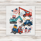 Our Patriotic Construction Trucks transfer is a little boy’s dream come true—featuring bold red, white, and blue diggers, cranes, and dump trucks decked out in stars, stripes, and Uncle Sam hats! Fireworks explode in the background, making this design a celebration on wheels.