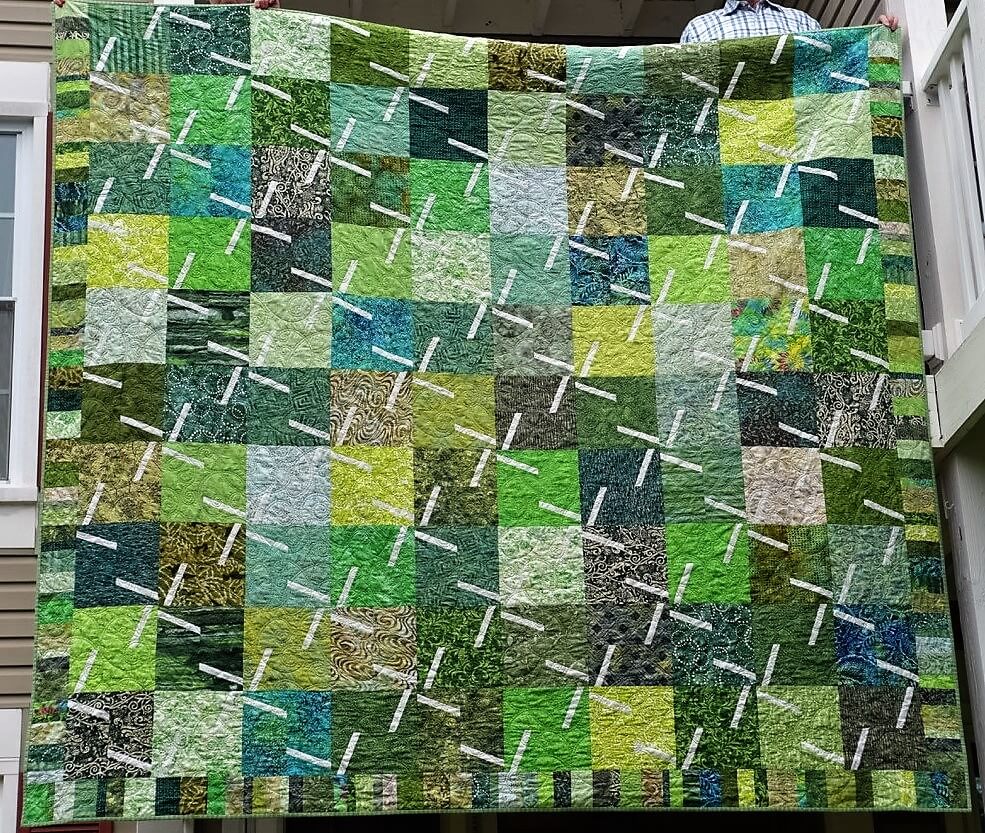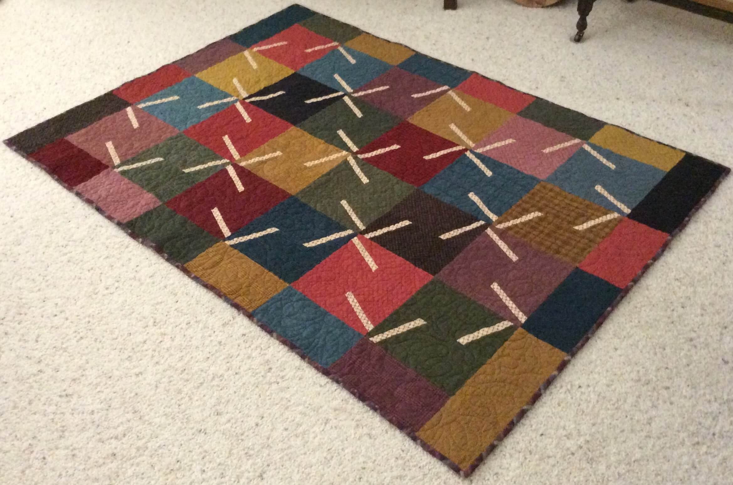 Crib 39” x 40” cover, Lap 49” x 60” cover, Twin 69” x 90” and Queen 99” x 100”. The scrappy border on 2 sides uses the remainders from the FQs.  The pattern includes an alternate border for the 3 larger sizes; still using the remainders of the FQs.