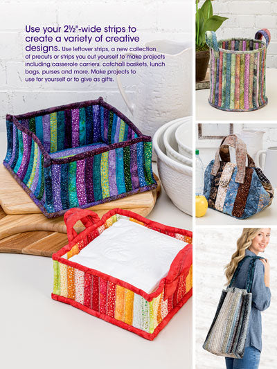 Use your 2 1/2"-wide strips to create a variety of creative designs. Use leftover strips, a new collection of precuts or strips you cut yourself to make projects ranging from casserole carriers, catchall baskets, lunch bags, purses and more. Make projects to use for yourself or to give as gifts.