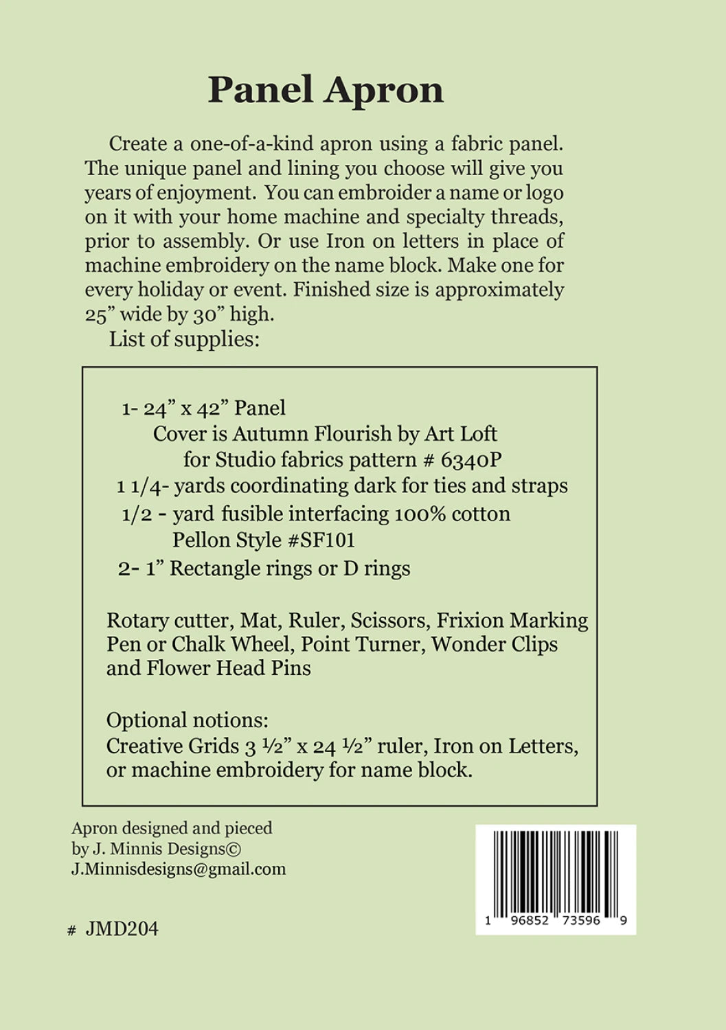 Create a one-of-a-kind apron using a fabric panel. The unique panel and lining you choose will give you years of enjoyment. Embroider a name or logo on it with your home sewing machine prior to assembly. Make one for every holiday or event. Apron is pieced and lined with pockets. Finished size approximately 25" wide by 30" high.