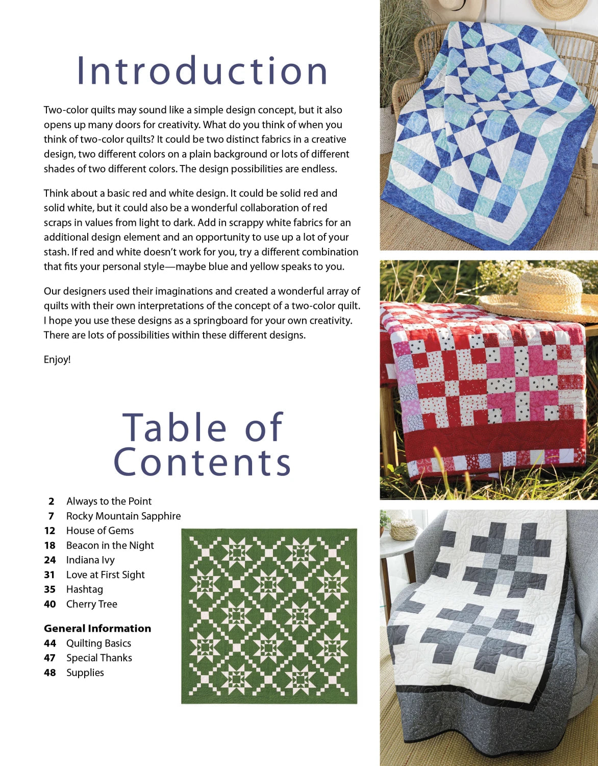 Get inspired by these eight different two-color quilts! It is a perfect combination of classy throw and bed quilts! Featured Designers: Nancy Scott, Chris Malone, Jennifer Thomas, Wendy Sheppard, Lyn Brown, Carolyn Cullinan McCormick, TeriAnn Harms & Cassie Harms.