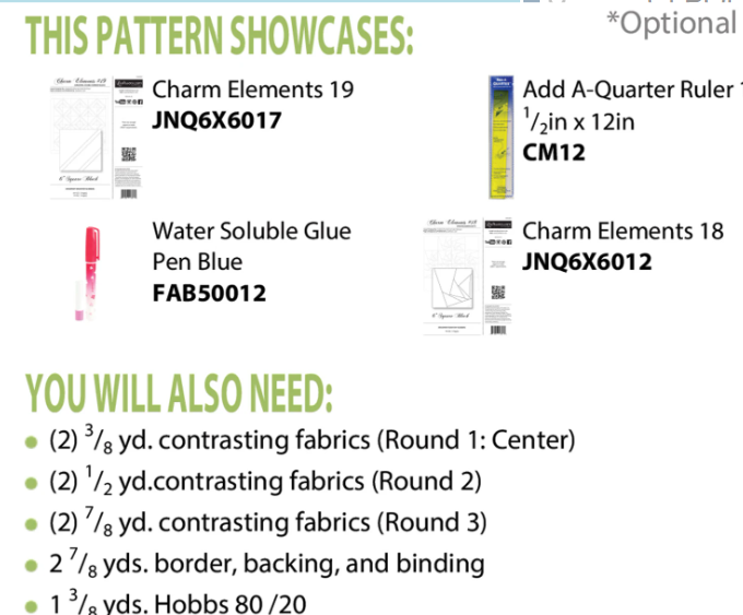 Introductory paper piecing pattern, includes fabric requirements and instructions to make the project shown. REQUIRES (purchased separately) both Charm Elements 18 and Charm Elements 19 paper piecing templates and instructions by Quiltworx.com.